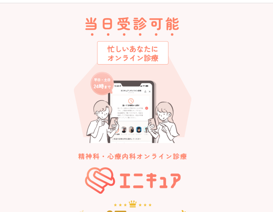 エニキュアは、スマートフォンやパソコンを使って精神科・心療内科の診察を受けられるオンラインクリニックです。