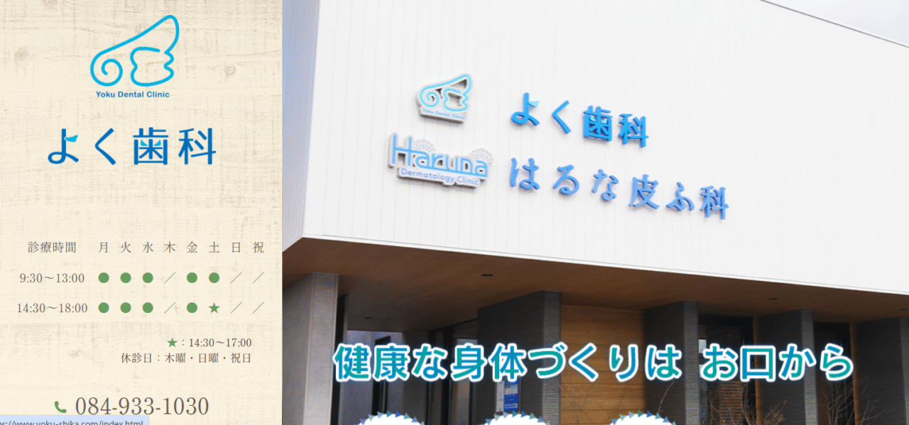 よく歯科は、広島県福山市に開業している歯科クリニックです。歯科診療で地域の皆さんの健康寿命を伸ばすことに貢献できることを目標とし、治療前のインフォームドコンセントを徹底するほか、知識や技術、設備のブラッシュアップを常に図り、適切な治療をご提供いたします。