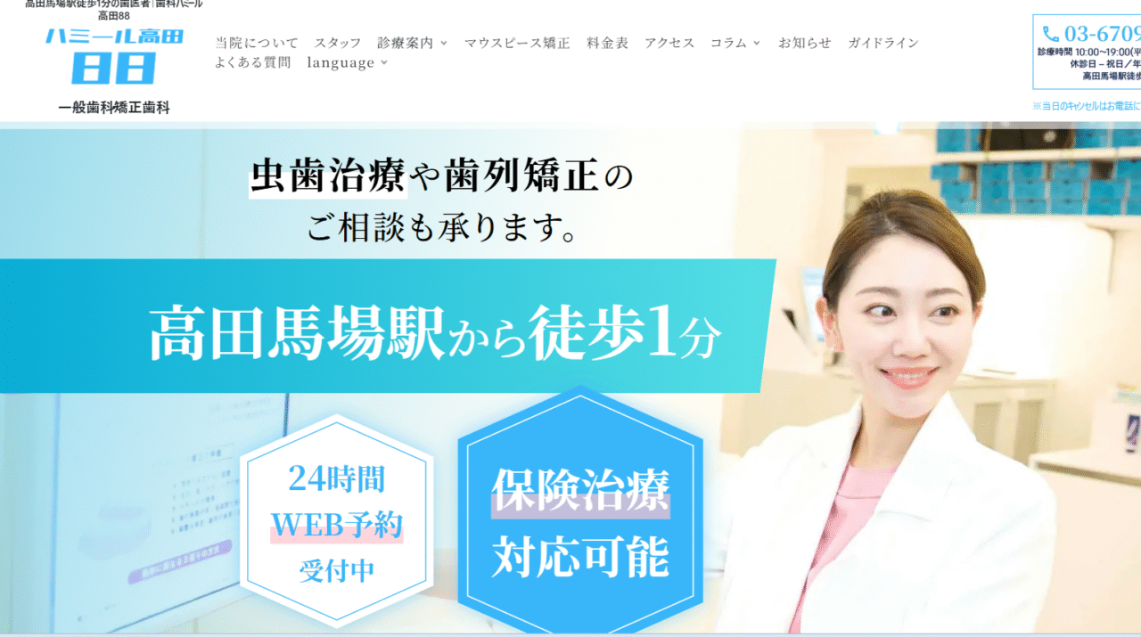歯科ハミール88は、東京都新宿区の高田馬場駅から徒歩1分の便利な立地に開業している歯科クリニックです。土日も営業しており、地域の皆さまが安心して通える歯科クリニックです。虫歯や歯周病などの一般歯科をはじめ、インプラント・矯正・ホワイトニング・予防歯科まで幅広く対応しています。